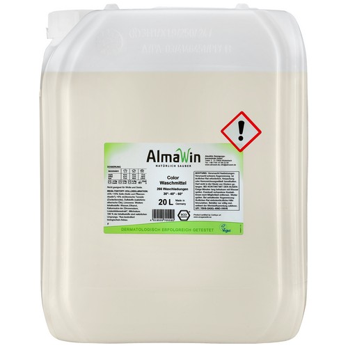 AlmaWin Color Waschmittel wäscht Buntes fasertief rein, sorgt für dauerhafte Farbbrillanz. Es ist geeignet für Textilien aus Natur-, Misch- und Kunstfasern von 30° - 60° C. Ohne Enzyme. Feiner Lindenblütenduft.