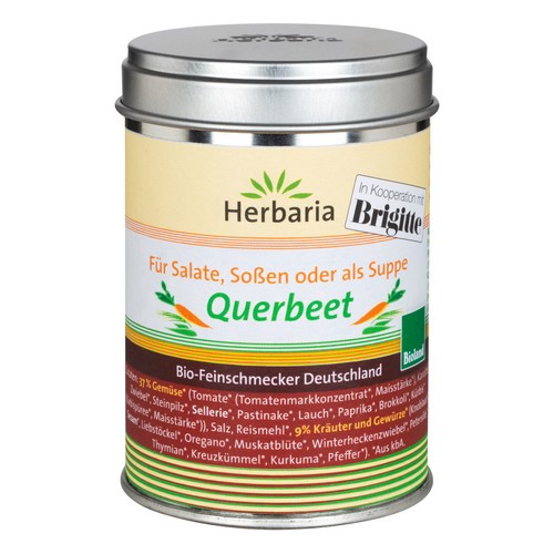 Herbaria Querbeet ist eine Bio-Gemüsebrühe in Bioland-Qualität für Suppen, Salate, Soßen und die 5 Minuten Tasse. Mit einem hohen Anteil ausgewähltem Gemüse (37%) und aromatische Kräuter- und Gewürze (9%). Natürlich würzig im Geschmack und selbstverständlich ohne Hefe oder Geschmacksverstärker - Querbeet durch den Gemüsegarten! 2 Esslöffel "Querbeet" ergeben ca. 1 Liter Gemüsesuppe.