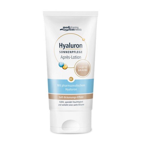 Die Hyaluron Après-Lotion enthält Hyaluronsäure in pharmazeutischer Qualität. Die Haut wird nach der Sonne optimal mit Feuchtigkeit versorgt. Ein Repair-Komplex beruhigt die sonnenverwöhnte Haut, lindert Hautirritationen und schützt gegen vorzeitige Hautalterung infolge von Hitzestress. Der zusätzlich enthaltene Soft-Bräunungs-Komplex verleiht der Haut schrittweise eine zarte und natürlich aussehende Sommerbräune. Die leichte Textur lässt sich gut verteilen und zieht schnell ein – für einen gleichmäßigen Bräunungs-Effekt ohne Streifenbildung. Verleiht auch ohne vermehrtes Sonnen der hellen, sonnenempfindlichen Haut eine schöne Sommerbräune.