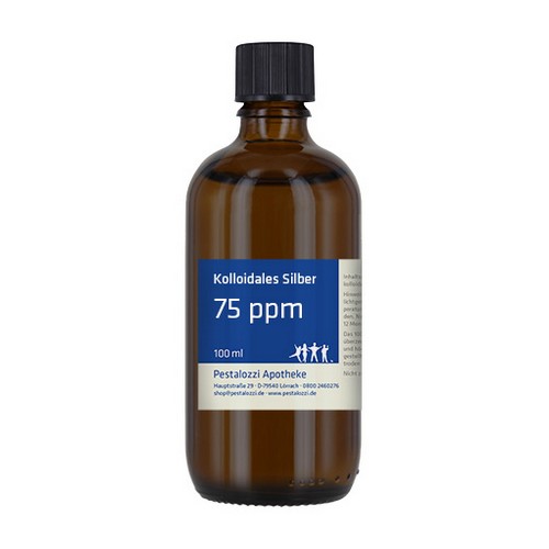 Das kolloidale Silber 75 ppm wird mit hochreinem destillierten Wasser unter qualifizierten Laborbedingungen frisch hergestellt und in einer dunklen Glasflasche geliefert. Die Herstellung erfolgt in der Apotheke unter überwachten Laborbedingungen. Das kolloidale Silber wird auf elektrolytischem Wege mit Hilfe eines entsprechenden Generators hergestellt. Dabei werden aus 99,99% reinem Silber kleinste Partikel gebildet und in destilliertem Wasser verteilt. Wir arbeiten dabei ohne Einsatz von Zusatzstoffen. Bitte beachten Sie: Kolloidales Silber ist kein Arzneimittel und daher auch ohne Angabe einer Indikation. Aus rechtlichen Gründen bieten wir daher das kolloidale Silber nur für technische Zwecke an. Nicht zum Einnehmen.