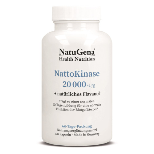 Der Name „Natto“ stammt von einem japanischen Sojabohnengericht. Nattokinase ist ein Enzym aus der Sojabohne, welches durch Fermentation der Bohnen gewonnen wird. Es besteht aus mehr als 270 Aminosäuren und gehört zu der Enzymgruppe der Proteasen. NattoKinase 20 000 beinhaltet neben dem Enzym auch Kakao-Extrakt mit einem 50 %-tigem Flavanolanteil. Durch das Vitamin C aus der Camu-Camu trägt NattoKinase 20 000 zu einer normalen Kollagenbildung für eine normale Funktion der Blutgefäße bei.