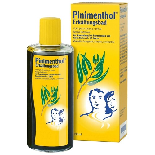 Das Pinimenthol® Erkältungsbad enthält eine therapeutische Wirkstoffkombination aus hochwertigen ätherischen Ölen: Eucalyptusöl, Campher und Menthol ergänzen sich optimal. Es eignet sich ab 12 Jahren. Und für die kleinen Patienten ab 2 Jahren gibt es das Pinimenthol® Erkältungsbad für Kinder mit Eucalyptusöl. Aus dem mild schäumenden Erkältungsbad gehen die hochwirksamen Inhaltsstoffe besonders leicht in die Atemluft über und gelangen so über Mund und Nase zu den Nebenhöhlen und in die Bronchien. Zusätzlich wirkt das Pinimenthol® Erkältungsbad nachhaltig von innen heraus: Die ätherischen Öle werden nämlich auch über die Haut aufgenommen und anschließend über die Blutbahn in die Atemwege transportiert. Auch in den unteren Atemwegen können die Inhaltsstoffe so ihre Wirkung entfalten.