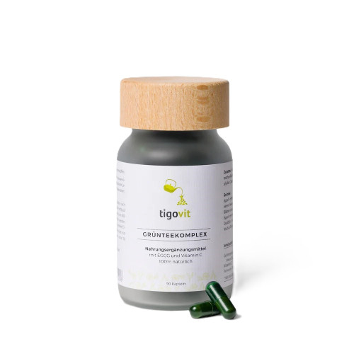 Der tigovit Grünteekomplex enthält einen hochwertigen Grüntee-Extrakt aus der Pflanze Camelia sinensis. Der grüne Tee besteht aus vielen wertvollen Stoffen. Vor allem die Catechine, darunter das EGCG (Epigallocatechin-3-gallat), sind von besonderem Interesse. Das EGCG ist besonders hoch konzentriert in den Teeblättern enthalten. Catechine sind auch für den typischen Geschmack des Tees verantwortlich.